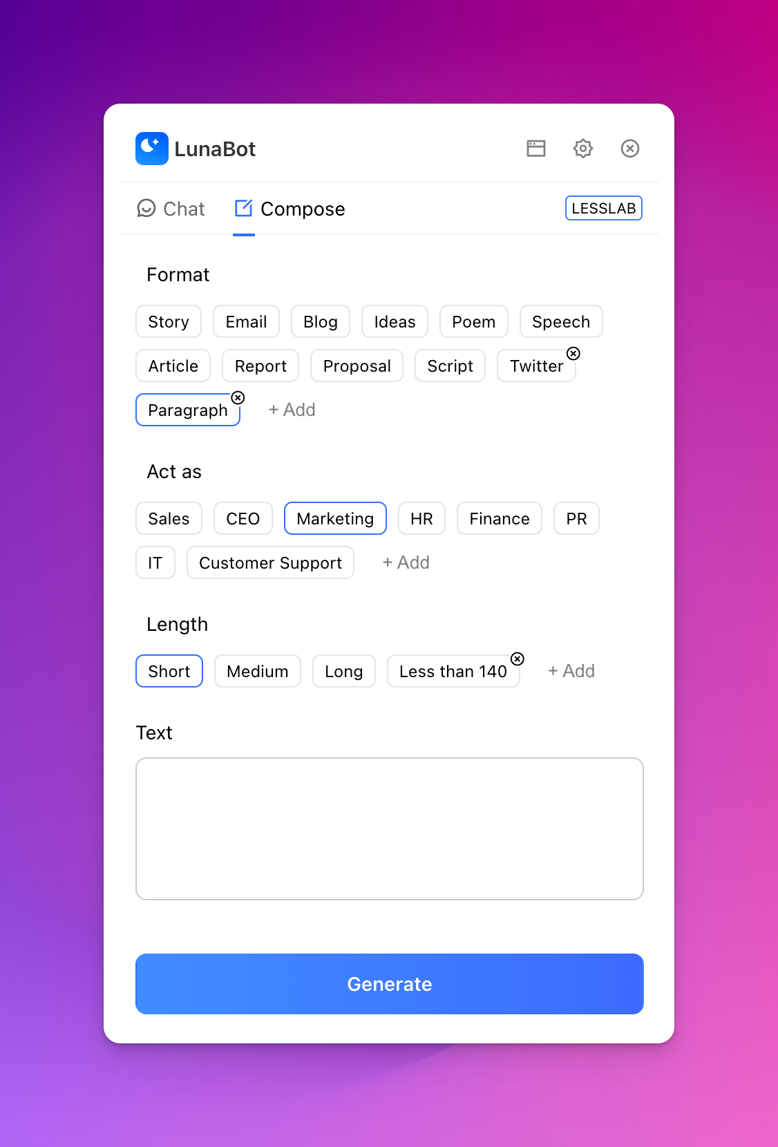 After receiving feedback from our users, we have revamped the user interface of Lunabot to make it more user-friendly. Our team has worked hard to redesign the compose UI to ensure that it is intuitive and easy to use. We have also added support for custom options, allowing you to personalize your Lunabot to better suit your needs. As an added bonus, the chat tabs now have a stick-on feature, making it quick and easy to access Lunabot whenever you need it. We are excited to bring you these new changes, and we hope that you find them useful!