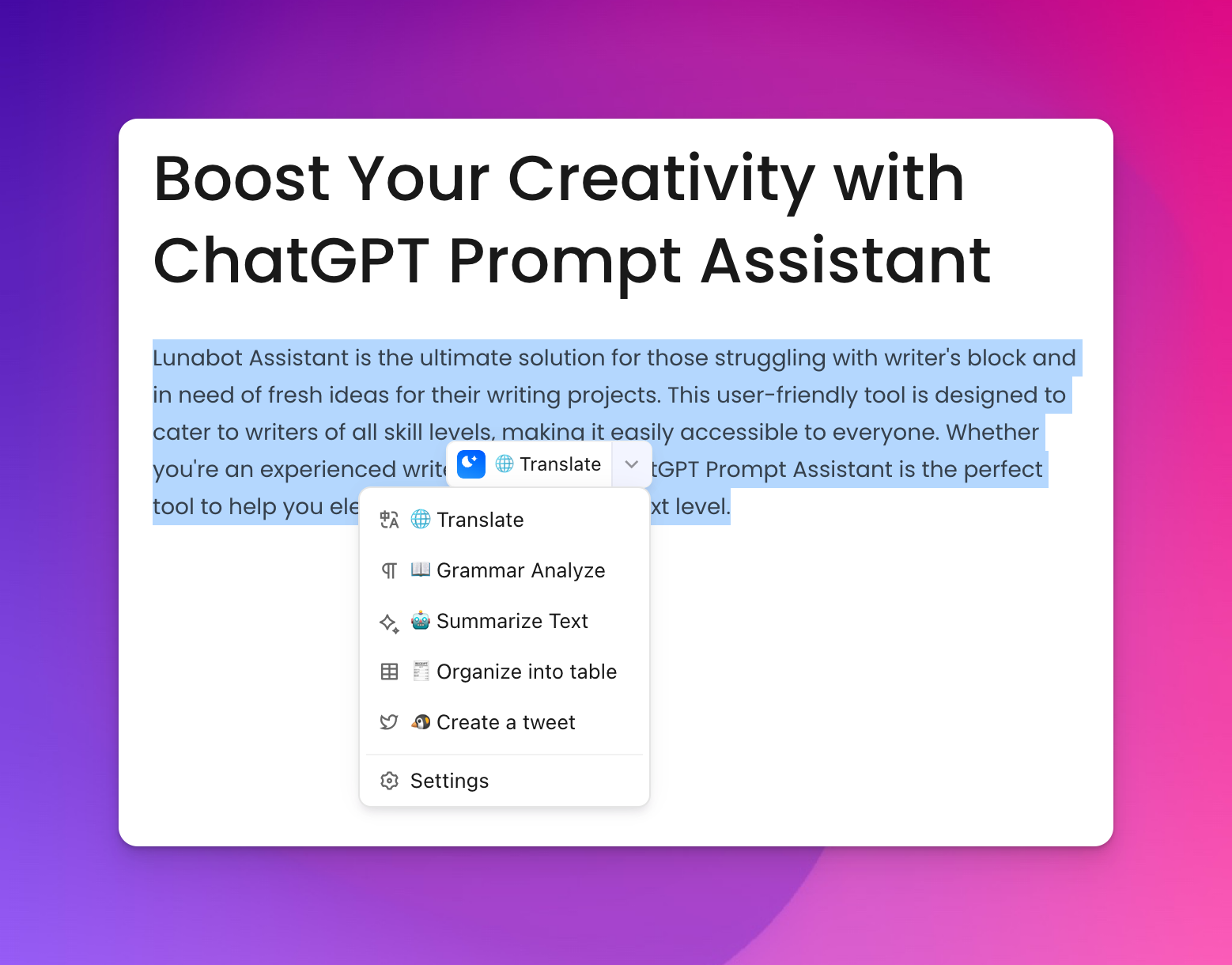 We at LunaBot have redesigned our text selection shortcuts to be even more user-friendly. With our new prompt system, you can easily and quickly select the text you need without any hassle. Our goal is to make LunaBot the most efficient writing assistant out there, and we believe this update brings us one step closer to achieving that. Give it a try and let us know what you think!