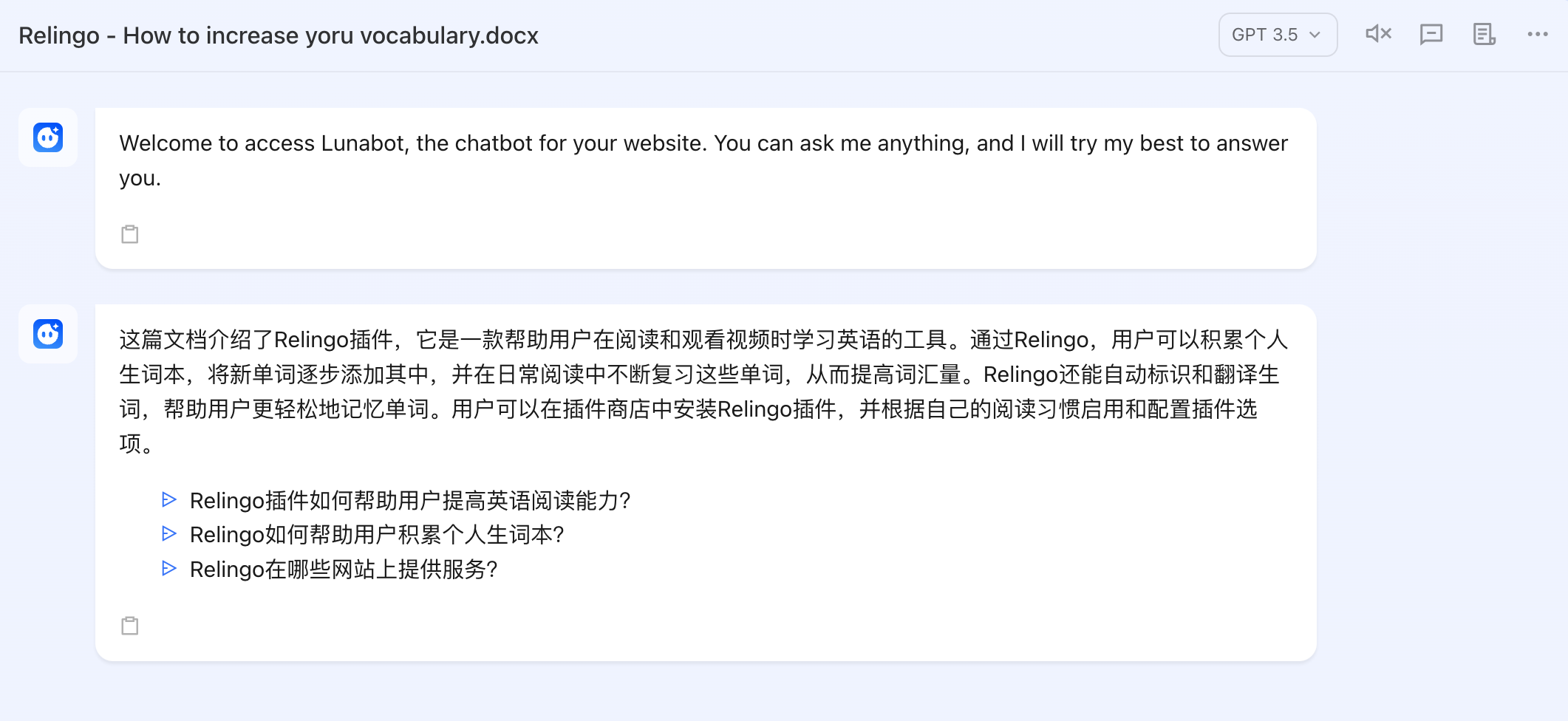 步骤 4: 文件上传并解析后,你可以在聊天窗口中与 Lunabot 进行交互。例如,询问:“这篇文档的主要内容是什么?”或“你从这个 PDF 中能总结出哪些关键点?”Lunabot 会利用 ChatGPT PDF 技术为你提供智能答案。
