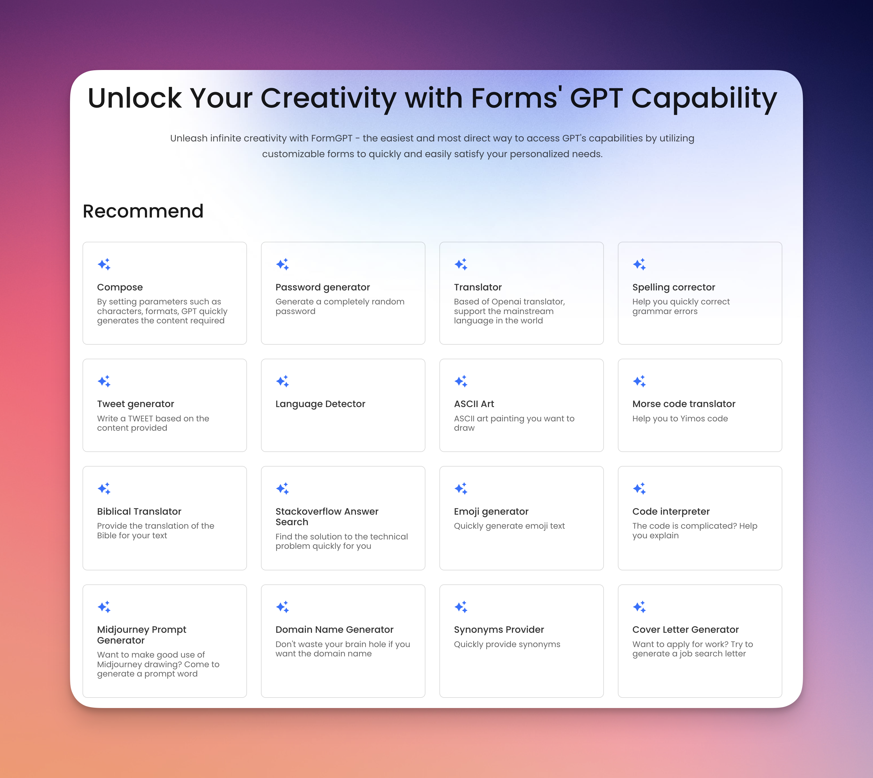 例如,当用户填写表单时,LunaBot FormGPT可以自动为用户提供答案。此外,LunaBot FormGPT还支持语言翻译功能,可以将用户输入的语言自动翻译成你所需要的语言,这个功能对于国际化的应用非常有用。除此之外,LunaBot FormGPT还支持密码生成和ASCII生成等多种功能,可以帮助你生成高强度的密码,或生成各种有趣的ASCII艺术品。